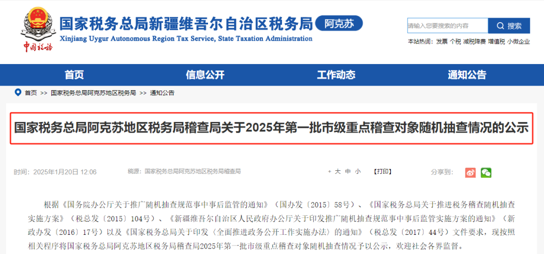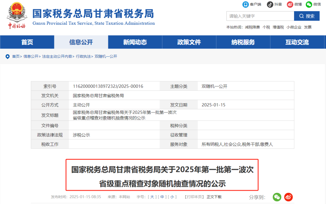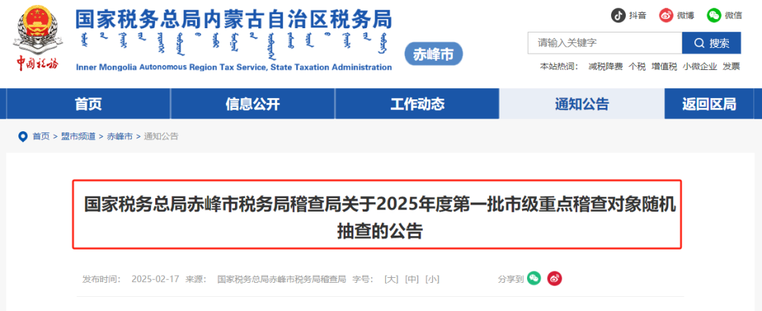 不仅是甘肃,内蒙赤峰市税局也发布了《关于2025年度第一批市级重点稽查对象随机抽查的公告》